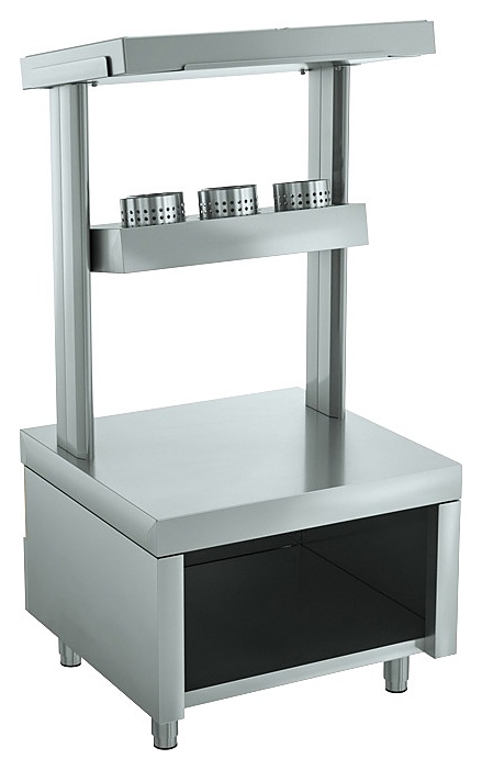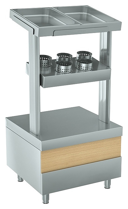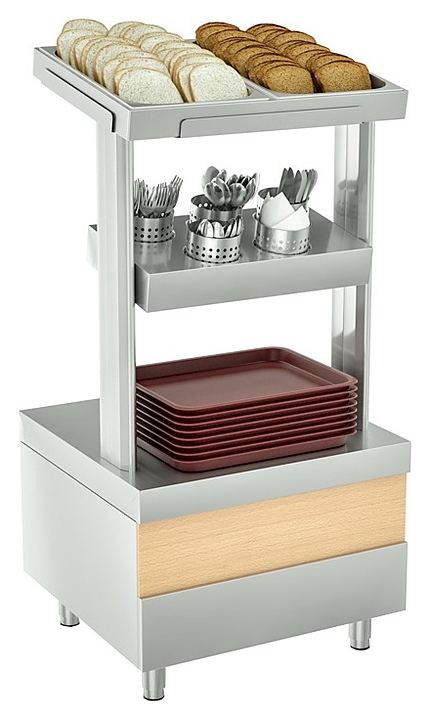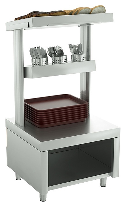 Стойка ATESY Ривьера предназначена для хранения столовых приборов в доступности для посетителей на предприятиях общественного питания. Модель оборудована стойкой с двумя полками, одна из которых съемная, а во вторую встроены лотки для приборов. Особенности: