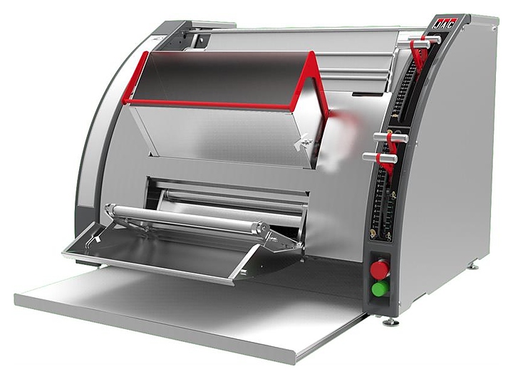 Тестозакаточная машина Jac Forma используется на предприятиях общественного питания и торговли, в пекарнях и кондитерских для формования заготовок для батонообразных изделий и багетов. Модель оснащена 3 раскаточными валиками, выходной полкой на скользящих направляющих, эргономичными рычагами регулировки, сверхбыстрой сменой лент без демонтирования машины. Валы выполнены из пищевого ПЭТ. Модель превращается из формовочной машины в раскаточную при открытии переднего выводного конвейера для выхода плоских типов изделий. Опции (заказываются отдельно):