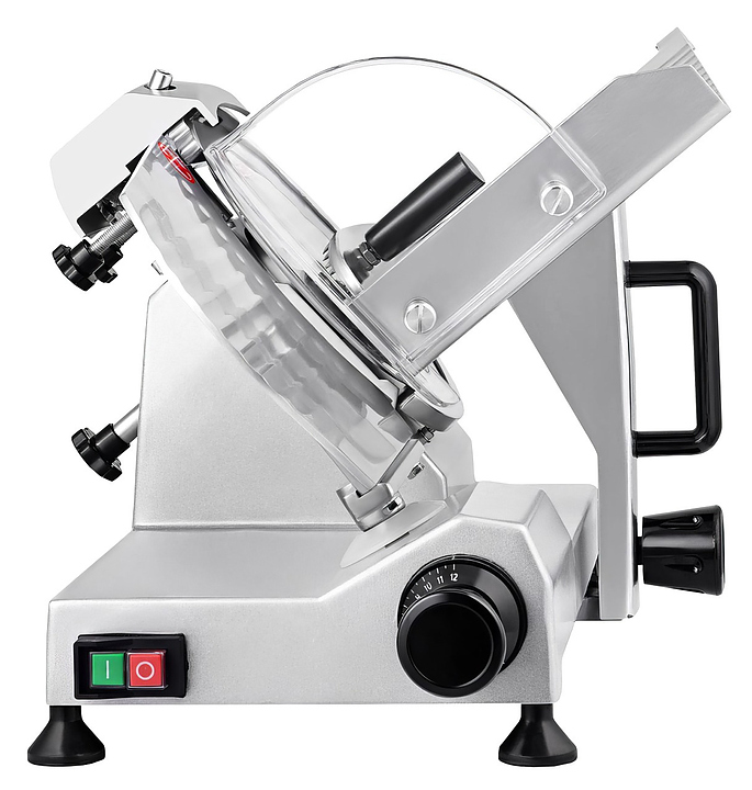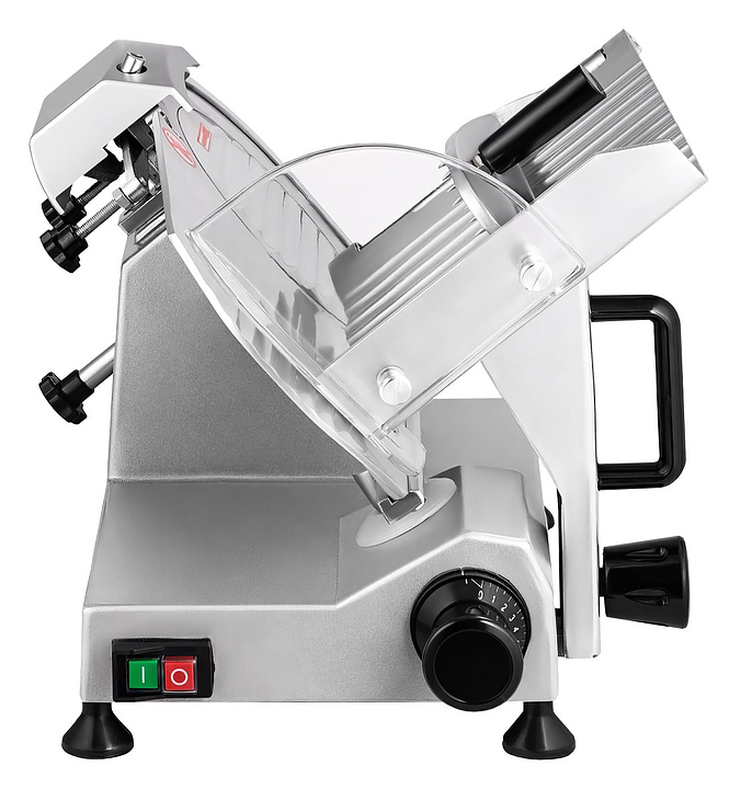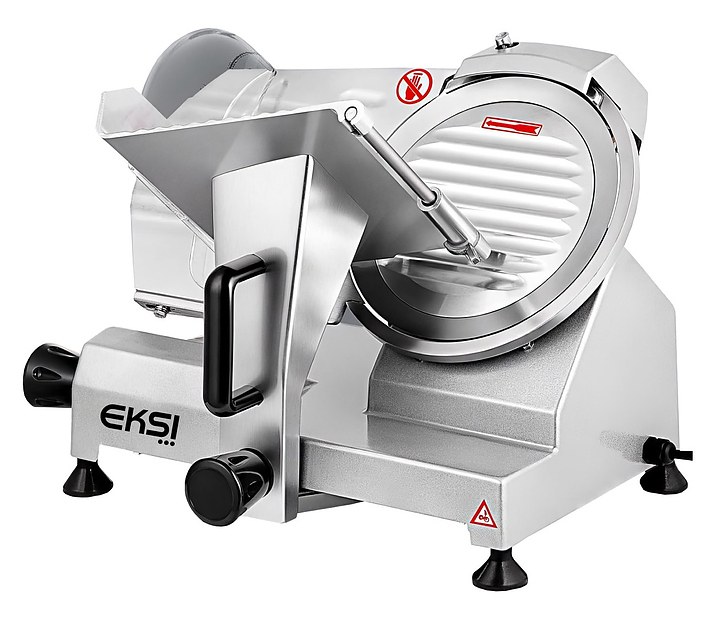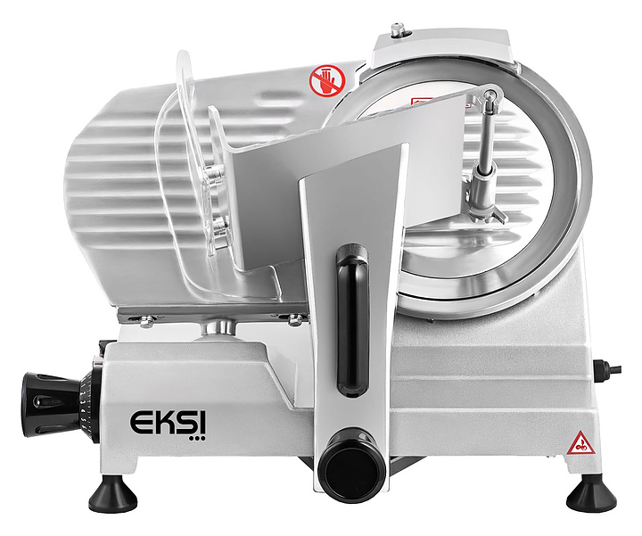 Слайсер EKSI HBS-300A предназначен для нарезки продуктов на ломтики заданной толщины на предприятиях пищевого производства, общественного питания и торговли. Модель оснащена встроенным заточным устройством, округлым ножом, подвижной кареткой и ручкой-фиксатором. Корпус выполнен из окрашенного литого анодированного алюминиевого сплава. Особенности: