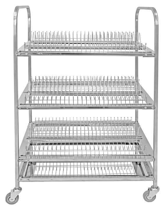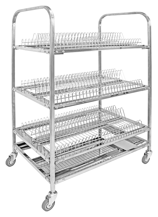 Транспортировочная тележка Hessen ТТ-3 8/5 используется на предприятиях пищевой промышленности, общественного питания и торговли для сушки и транспортировки тарелок. Модель оснащена поддоном для сбора воды и 4 колесами, одно из которых с тормозом. Изделие произведено с использованием программы Technology without Injuries - комплекса технологических решений, направленных на уменьшение травмоопасности для персонала, работающего на оборудовании. Опорные дуги выполнены из нержавеющего квадратного профиля 20х20 мм, поддон - из пищевой нержавеющей стали AISI 430, решетка - из никелированной стали. Дополнительные характеристики: