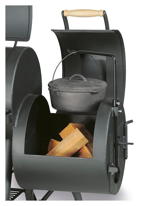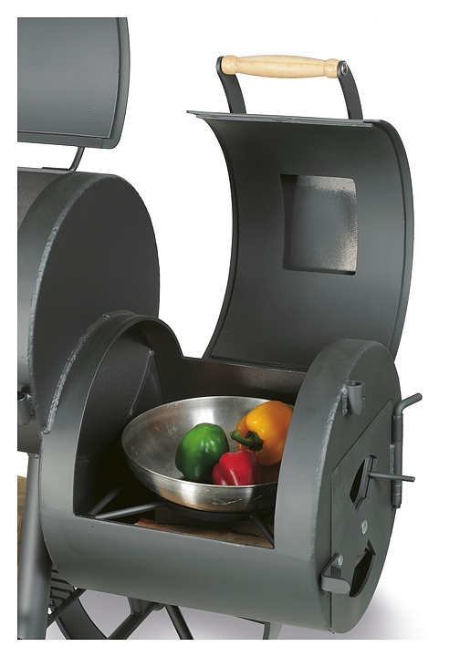 Гриль-коптильня Smoky Fun Big Chief 5 предназначен для горячего и холодного копчения, прямого и косвенного гриллинга продуктов и полуфабрикатов, запекания больших кусков мяса и приготовления ухи в котелке на предприятиях общественного питания и торговли, в частных и загородных домах. Дрова или древесный уголь разжигаются в специальном отсеке, после чего гриль наберет необходимую рабочую температуру. Температура регулируется с помощью поддувала на дверцах камеры сгорания углей и одновременно с помощью шиберной заслонки на дымоходе. Решетка выполнена из нержавеющей стали, корпус - из толстой термостойкой низкоуглеродистой стали толщиной 5 мм. Благодаря этому поверхность корпуса идеально ровная без следов зачистки, рябизны и прочих дефектов, а также менее восприимчива к высоким температурам, что увеличивает срок службы. Особенности: