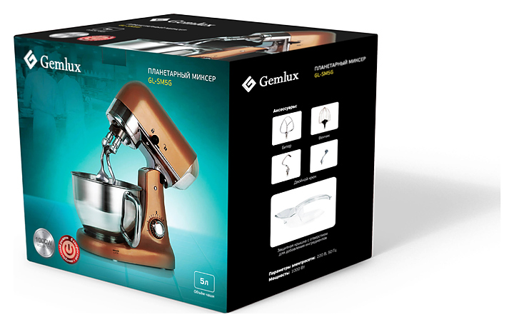 Планетарный миксер Gemlux GL-SM5G серии Gold предназначен для замеса различного вида теста жидкой консистенции, взбивания яиц, сливок, кремов, муссов и приготовления фарша в частных домах и квартирах. Модель оснащена откидной головкой, фиксирующейся специальным рычагом, и съемной дежей с защитной крышкой с отверстием для добавления ингредиентов в процессе замеса. Корпус выполнен из алюминия, дежа - из нержавеющей стали. В комплект поставки входят двойный крюк для теста, плоский битер (лопатка) и венчик. Особенности: