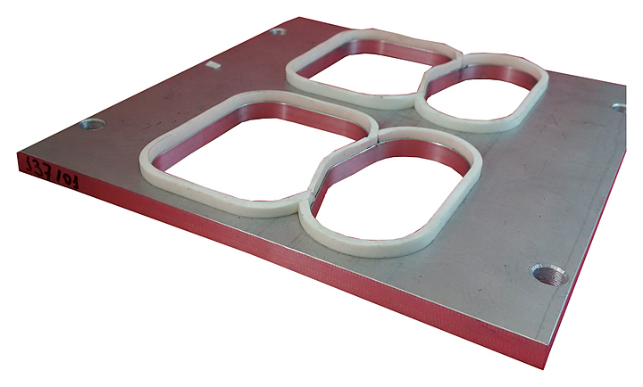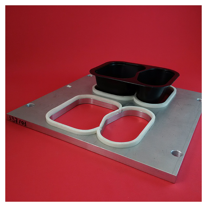 Форма VASSILII № 0137 с 2 двухсекционными отверстиями используется совместно с запайщиком лотков 200х273 мм на предприятиях общественного питания и торговли для запайки полипропиленовых контейнеров прямоугольной формы. Характеристики: