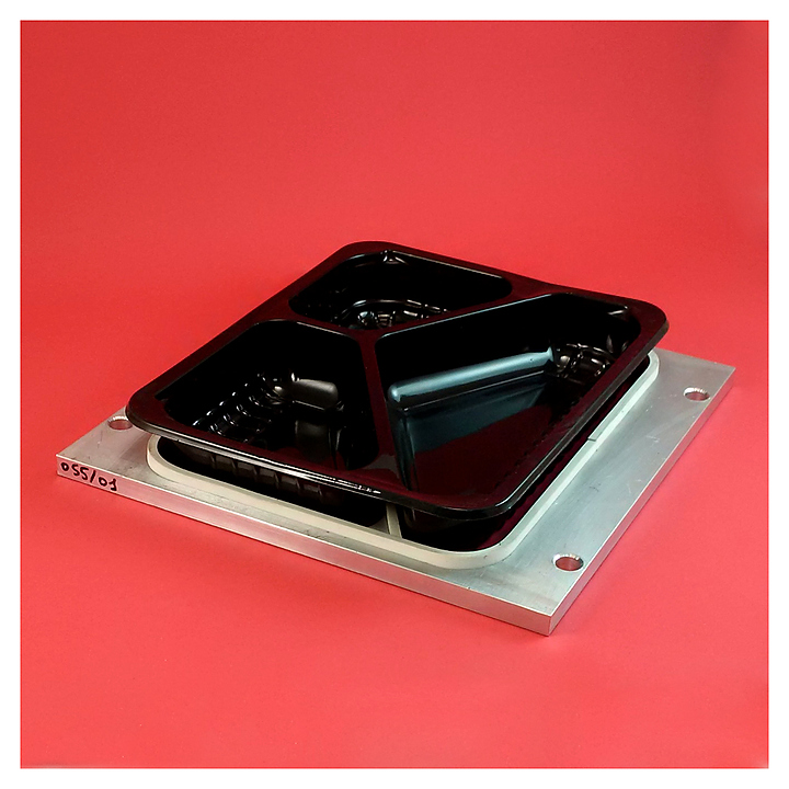Форма VASSILII № 0055 с трехсекционным отверстием используется совместно с запайщиком лотков 200х273 мм на предприятиях общественного питания и торговли для запайки полипропиленовых белорусских контейнеров прямоугольной формы. Характеристики: