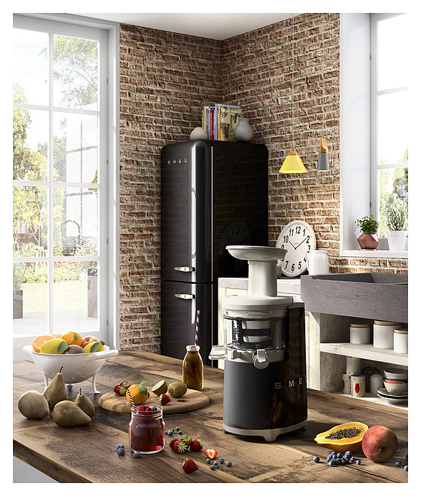 Шнековая соковыжималка Smeg SJF01BLEU предназначена для приготовления пюре, ореховой пасты, коктейлей и соков из фруктов, овощей, ягод, трав, иголок хвойных деревьев, пророщенных семян овса, пшеницы, ржи и чечевицы в частных домах и квартирах. Модель выполнена в стиле 50-х годов. Шнек и чаша отжима изготовлены из ULTEM™, рычаг включения - из стали. Комплектация: