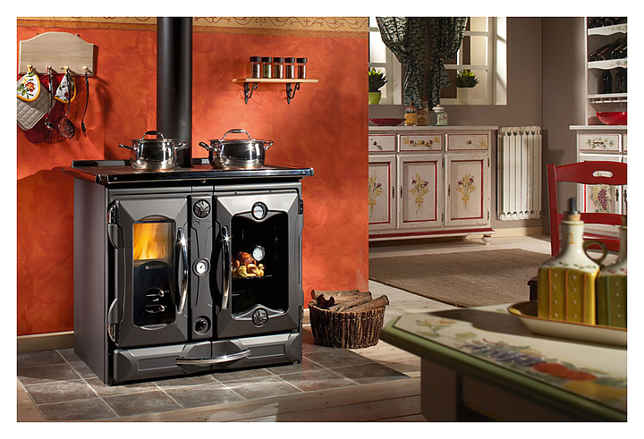 Дровяная печь-камин La Nordica TermoSuprema Compact D.S.A. серии TermoCucine a Legna предназначена для создания тепла в помещении в квартирах, частных домах и отелях. Модель оснащена системой повторного дожига, позволяющей сократить выбросы, системой чистого стекла, предотвращающей образование отложений, устройством безопасности D.S.A., снижающим быстро температуру воды, духовкой со стеклом и дровником. Духовка выполнена из эмали, плита и кольца - из полированного чугуна, рамка - из остеклованного чугуна. Оборудование облицовано эмалированным чугуном. Дополнительные характеристики: