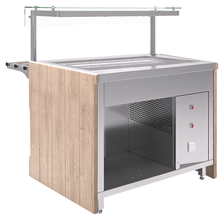 Холодильный прилавок Refettorio Capital RC11A используется в составе линии раздачи Capital на предприятиях общественного питания и торговли для выкладки, демонстрации и последующей раздачи порционных холодных закусок и третьих блюд, требующих хранения в охлажденном состоянии. Модель оснащена охлаждаемой столешницей с углублением и открытым доступом к продуктам. Столешница и рабочая ванна выполнены из нержавеющей листовой стали, фасад - из ламинированного МДФ. Особенности: