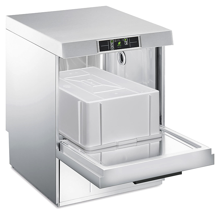 Посудомоечная машина с фронтальной загрузкой Smeg UD526DS серии Topline используется на предприятиях общественного питания и торговли для мойки столовых приборов, тарелок, стаканов, чашек и другой посуды. Модель оснащена электронной панелью управления. Корпус выполнен из нержавеющей стали AISI 304. Комплектация: