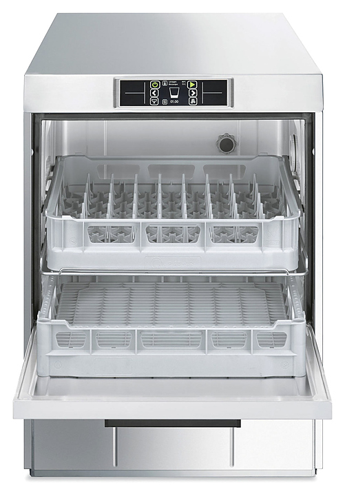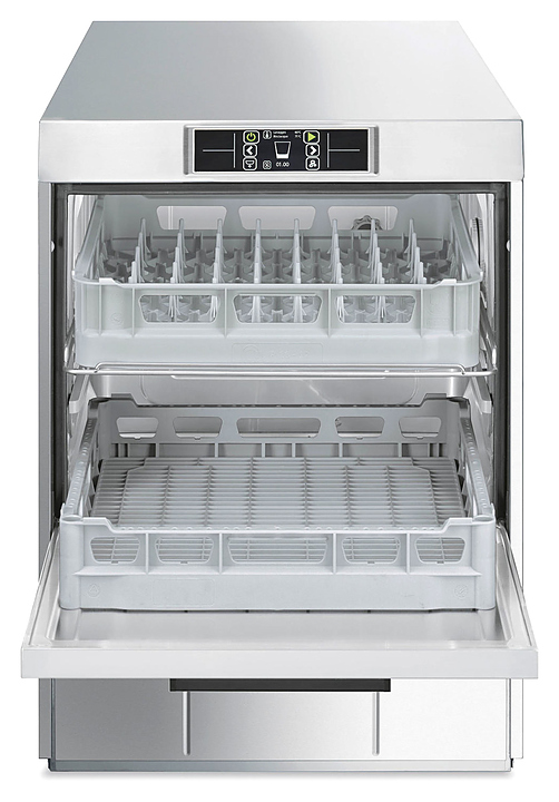 Посудомоечная машина с фронтальной загрузкой Smeg UD522DS серии Topline используется на предприятиях общественного питания и торговли для мойки столовых приборов, тарелок, стаканов, чашек и другой посуды. Модель оснащена электронной панелью управления. Корпус выполнен из нержавеющей стали AISI 304. Комплектация: