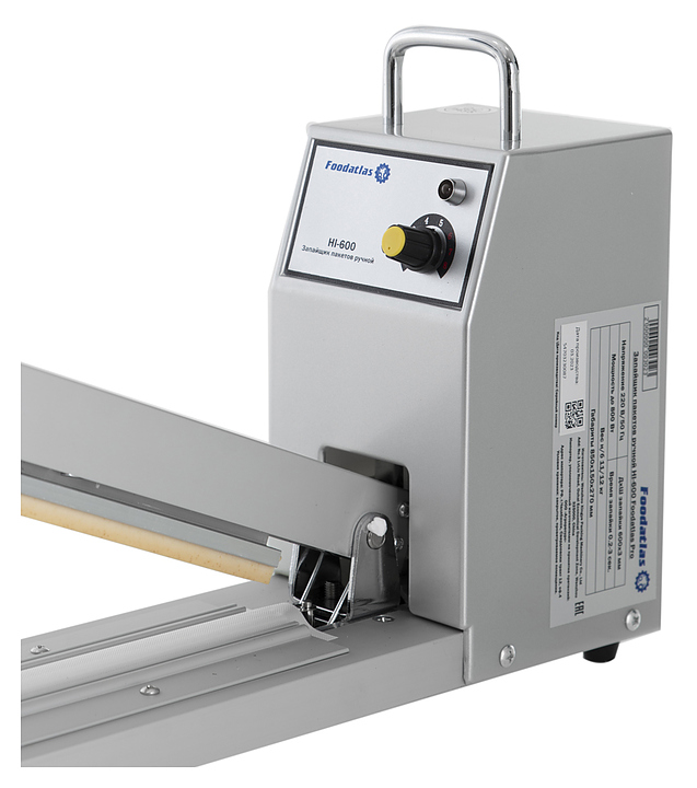 Ручной запайщик пакетов Foodatlas HI-600 Pro используется на предприятиях пищевой промышленности, общественного питания и торговли для упаковки пищевых продуктов, воды, химического сырья и продукции легкой промышленности в готовые пакеты из различных термопластичных пленок. Модель оснащена электронным датчиком контроля температуры. Дополнительные характеристики: