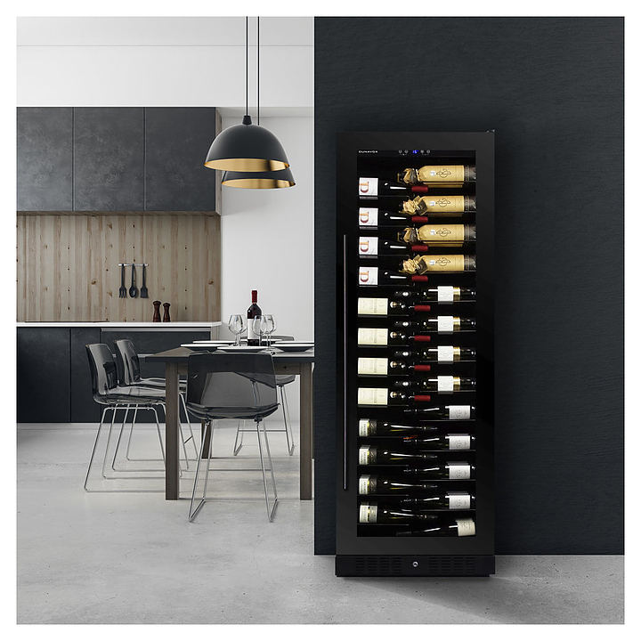 Винный шкаф Dunavox DX-143.468B серии Exclusive предназначен для демонстрации, хранения и создания оптимальных условий для сохранения всех вкусовых свойств вина в бутылках на предприятиях общественного питания, торговли, в барах, ресторанах, специализированных магазинах, частных домах или квартирах. Модель оснащена сенсорной панелью управления и LED-подсветкой синего цвета. Корпус выполнен из окрашенного металла, дверь - из тонированного стекла с защитой от ультрафиолетовых лучей, витринные выдвижные полки - с тонировкой. Особенности: