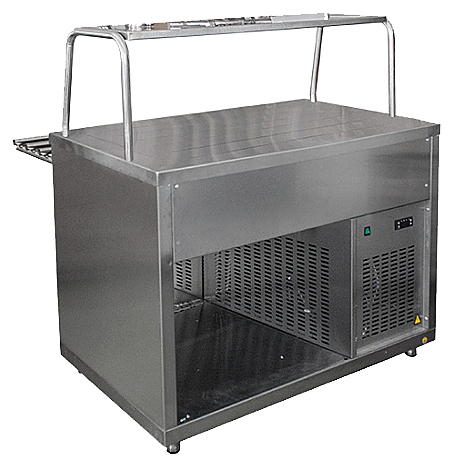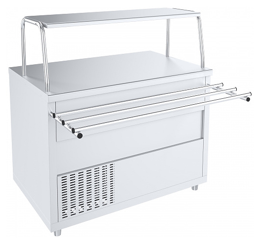 Холодильный стол Пищевые Технологии Лира-Профи Эко СОЭП/ЛПЭ использутся в составе линий раздач для кратковременного хранения и демонстрации холодных закусок, салатов, охлажденных напитков на предприятиях общественного питания и торговли. Модель оснащена нейтральной нишей для хранения инвентаря, полкой для тарелок, направляющими для подносов и регулируемыми по высоте ножками. Корпус выполнен из нержавеющей стали, отдельные элементы - из окрашенной оцинкованной стали. Особенности: