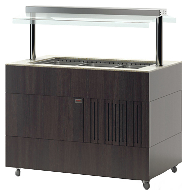 Салат-бар ТММ Антарес-Премиум ВВМХ/АПН предназначен для демонстрации, охлаждения и кратковременного хранения различных продуктов и блюд в составе линий раздач на предприятиях общественного питания и торговли. Модель оснащена открытой надстройкой с автоматическим подъемом и опусканием крышки. Корпус выполнен из МДФ, ламинированного противоударным HPL-пластиком Итальянского производства, столешница - из акрилового камня, ванна - из нержавеющей стали AISI 304, цельнозаливной корпус мармита и надстройка - из AISI 430. Особенности: