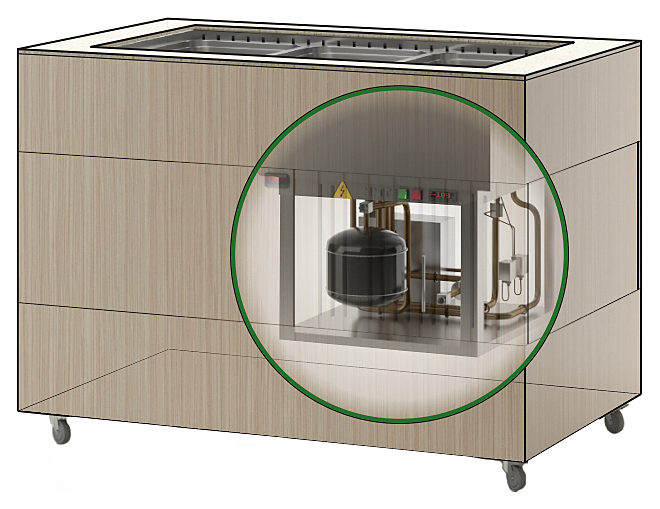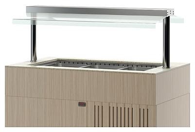 Салат-бар ТММ Антарес-Премиум ВВМХ/АПН предназначен для демонстрации, охлаждения и кратковременного хранения различных продуктов и блюд в составе линий раздач на предприятиях общественного питания и торговли. Модель оснащена открытой надстройкой с автоматическим подъемом и опусканием крышки. Корпус выполнен из МДФ, ламинированного противоударным HPL-пластиком Итальянского производства, столешница - из акрилового камня, ванна - из нержавеющей стали AISI 304, цельнозаливной корпус мармита и надстройка - из AISI 430. Особенности: