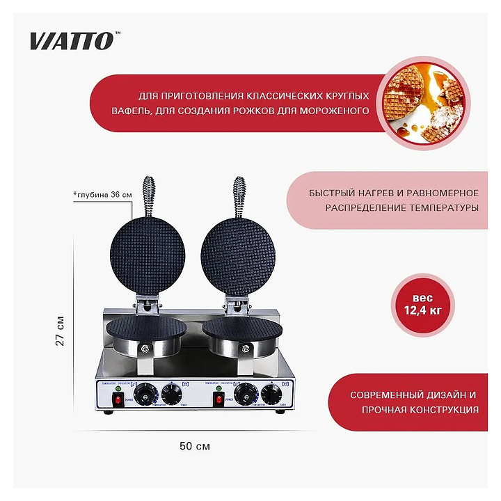 Вафельница VIATTO HCB-2 используется на предприятиях общественного питания и торговли для приготовления тонких вафель для рожка. Модель оснащена терморегулятором и таймером. Рабочие поверхности выполнены из алюминия с антипригарным покрытием. В комплект поставки входят 2 деревянных конуса. Особенности:
