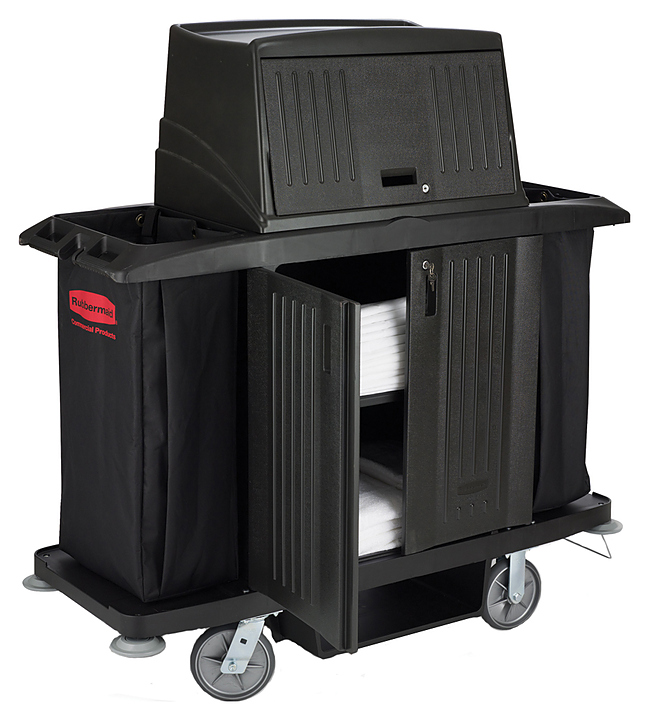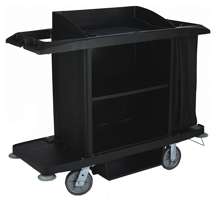 Гостиничная тележка Rubbermaid FG618900BLA предназначена для уборки комнат в отелях и гостиницах. Изделие оснащено безопасным боксом с запирающейся крышкой и 4 бесшумными колесами, 2 из которых снабжены блокирующими тормозами. Полной загрузки тележки хватает на уборку 16 комнат. Корпус выполнен из полипропилена. В комплект поставки входит виниловый мешок для мусора. Особенности: